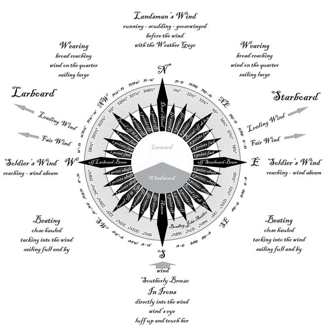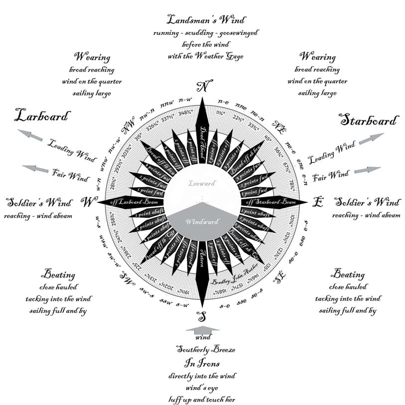 North, north by east, north nor’-east, nor’-east by north, Nor'-East, nor’-east by east, east nor’-east, east by north. East, east by south, east sou’-east, sou’-east by east, Sou’-East, sou’-east by south, south sou’-east, south by east. South, south by west, south sou’-west, sou’-west by south, Sou’-West, sou’-west by west, west sou’-west, west by south. West, west by north, west nor’-west, nor’-west by west, Nor’-West, nor’-west by north, north-nor’-west, north by west.